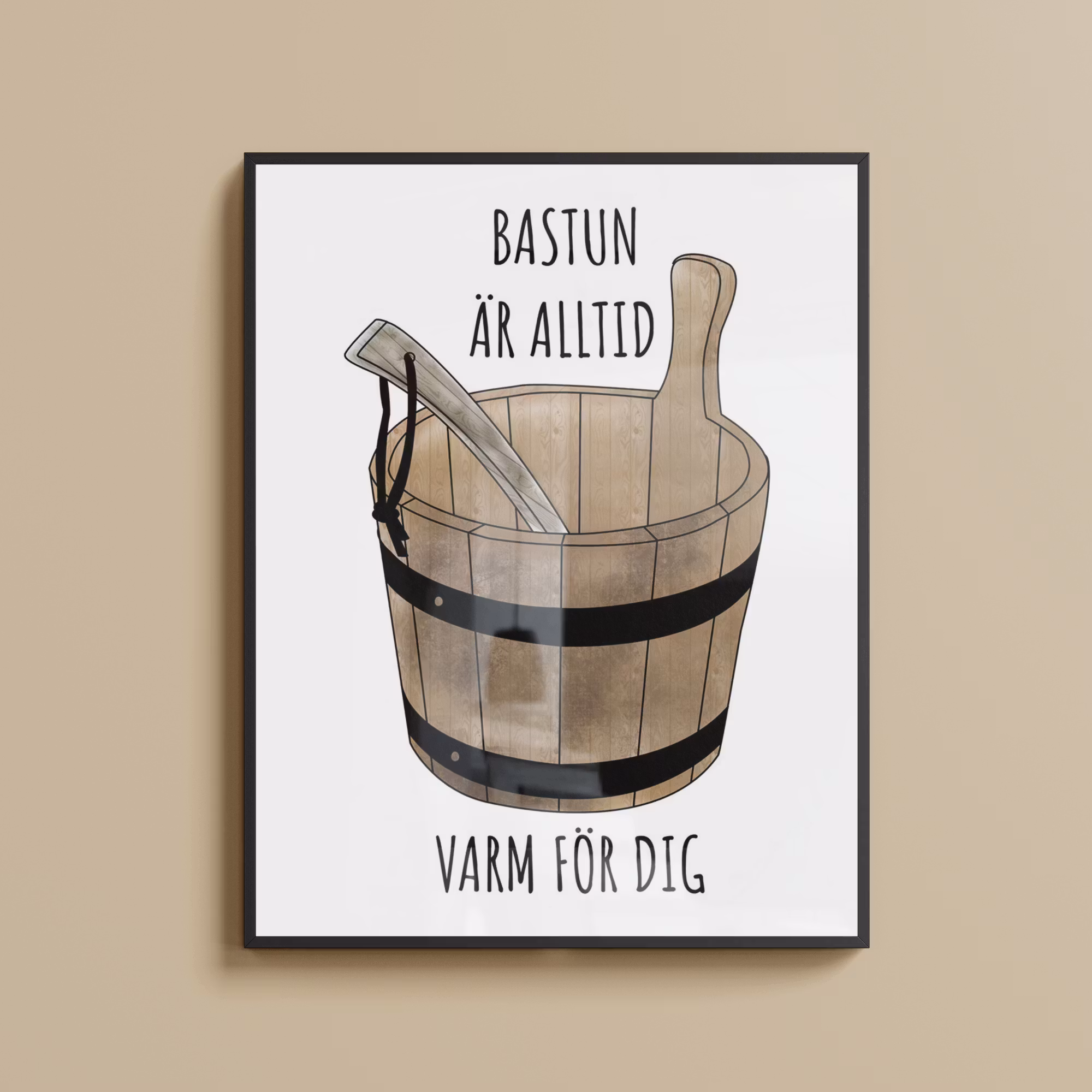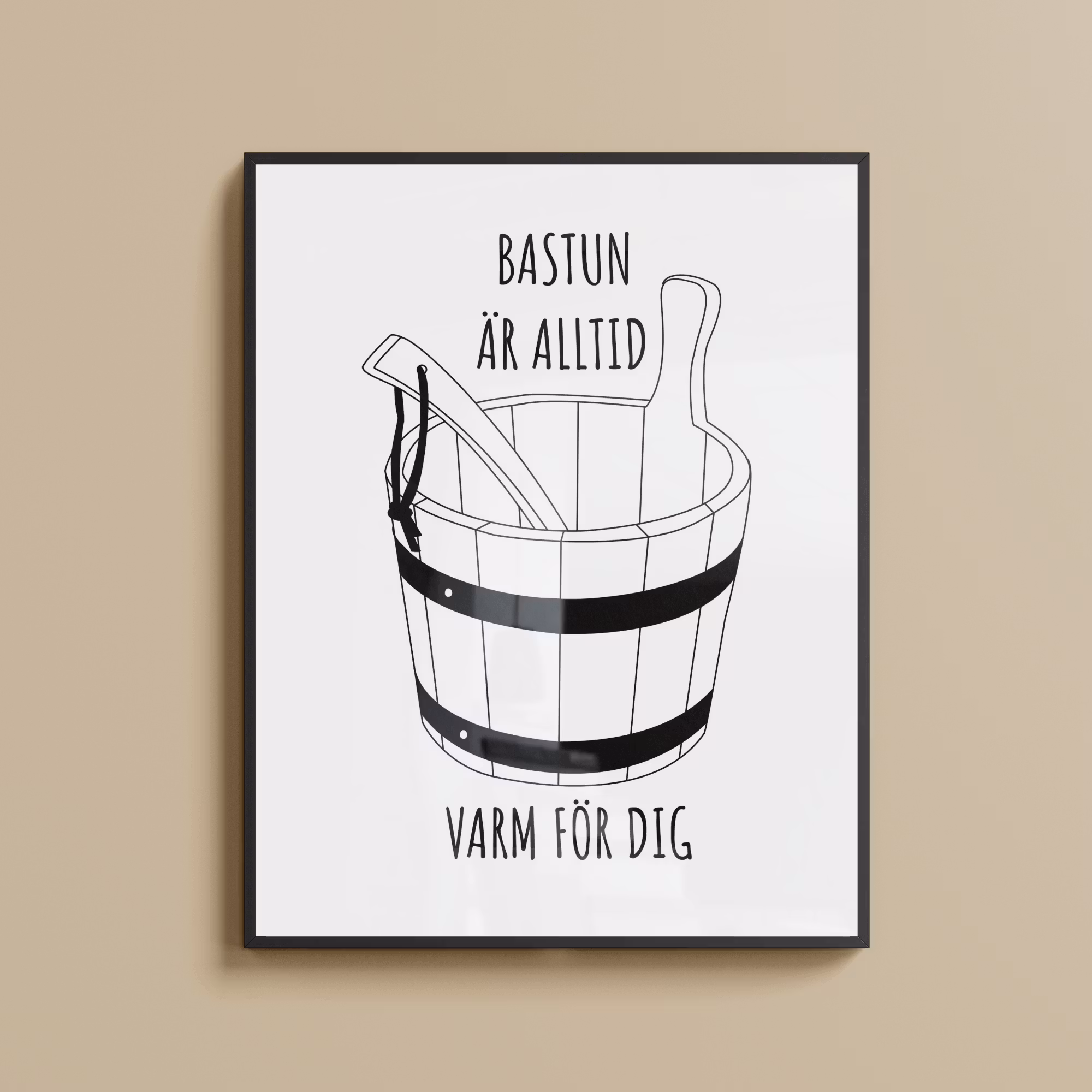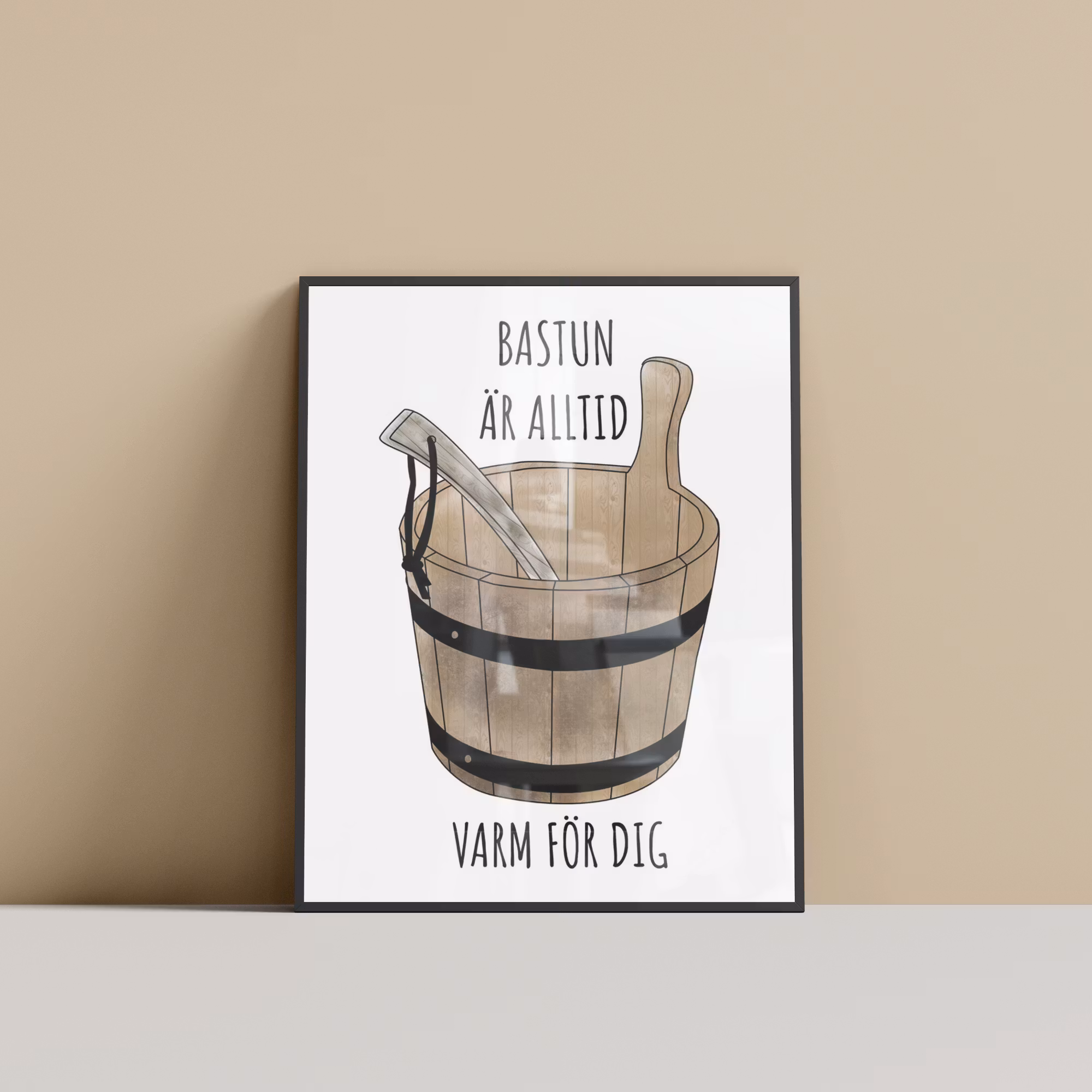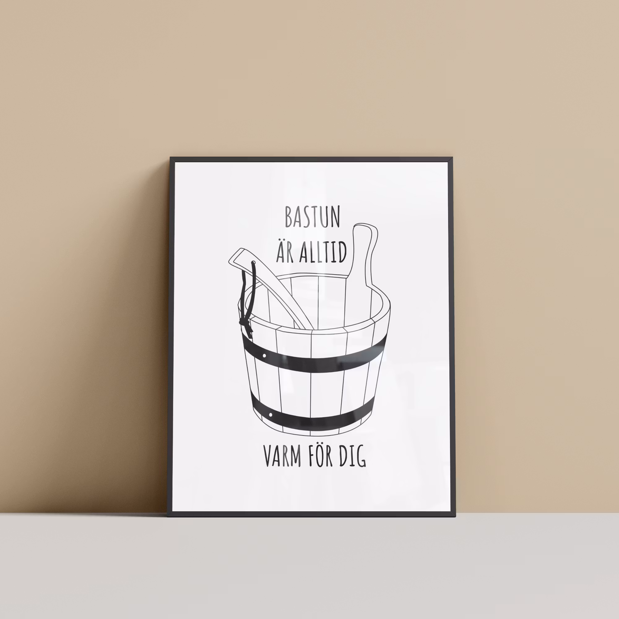 Förgyll hemmet, spastunden eller varför inte hela livet med denna bastu-tavla! Ett originellt print i brunt och svart med text samt motiv efter en traditionell bastuhink och skopa som har träiga detaljer och en varm känsla. Det är nästan så att man kan känna värmen av en bra löyly bara genom att se på verket.