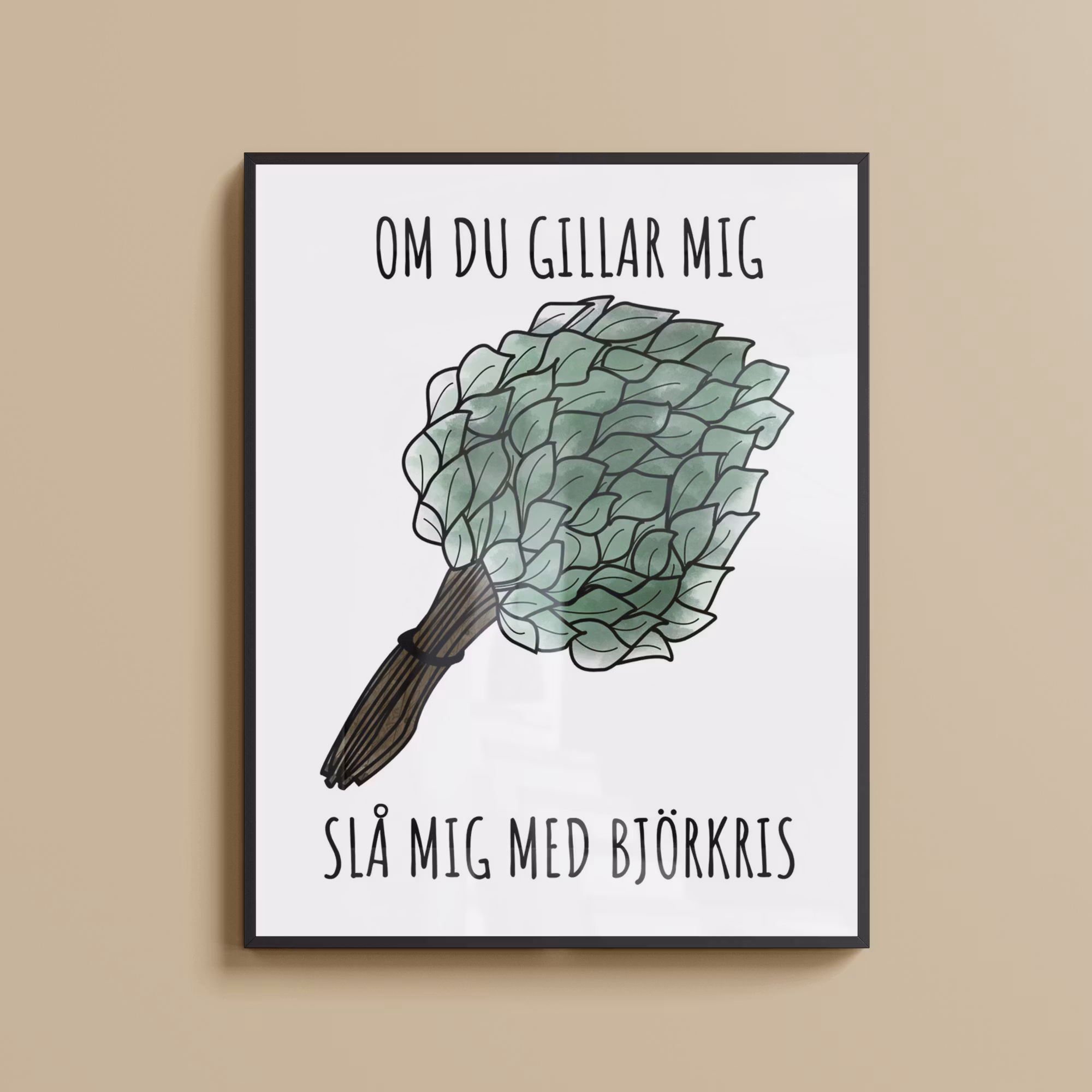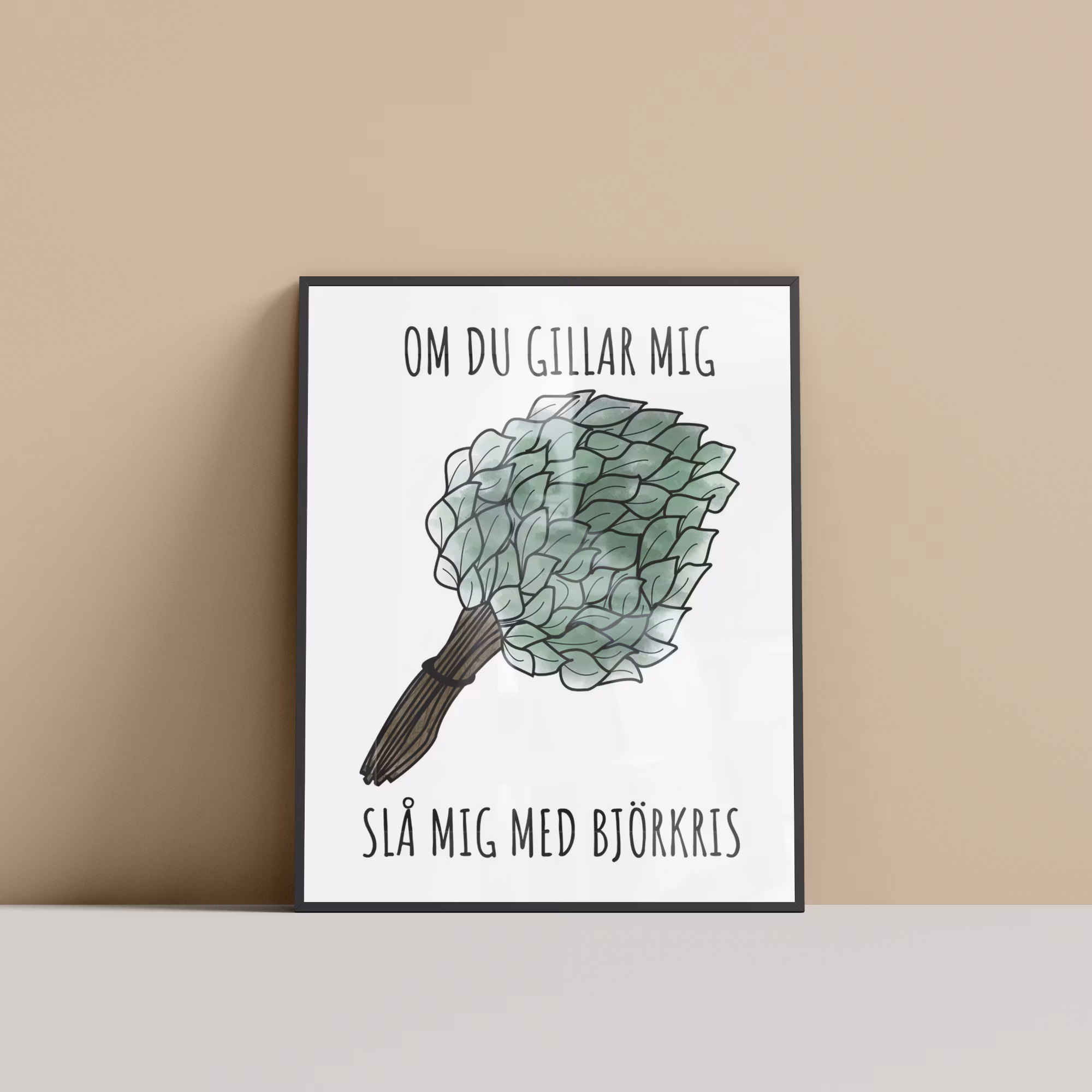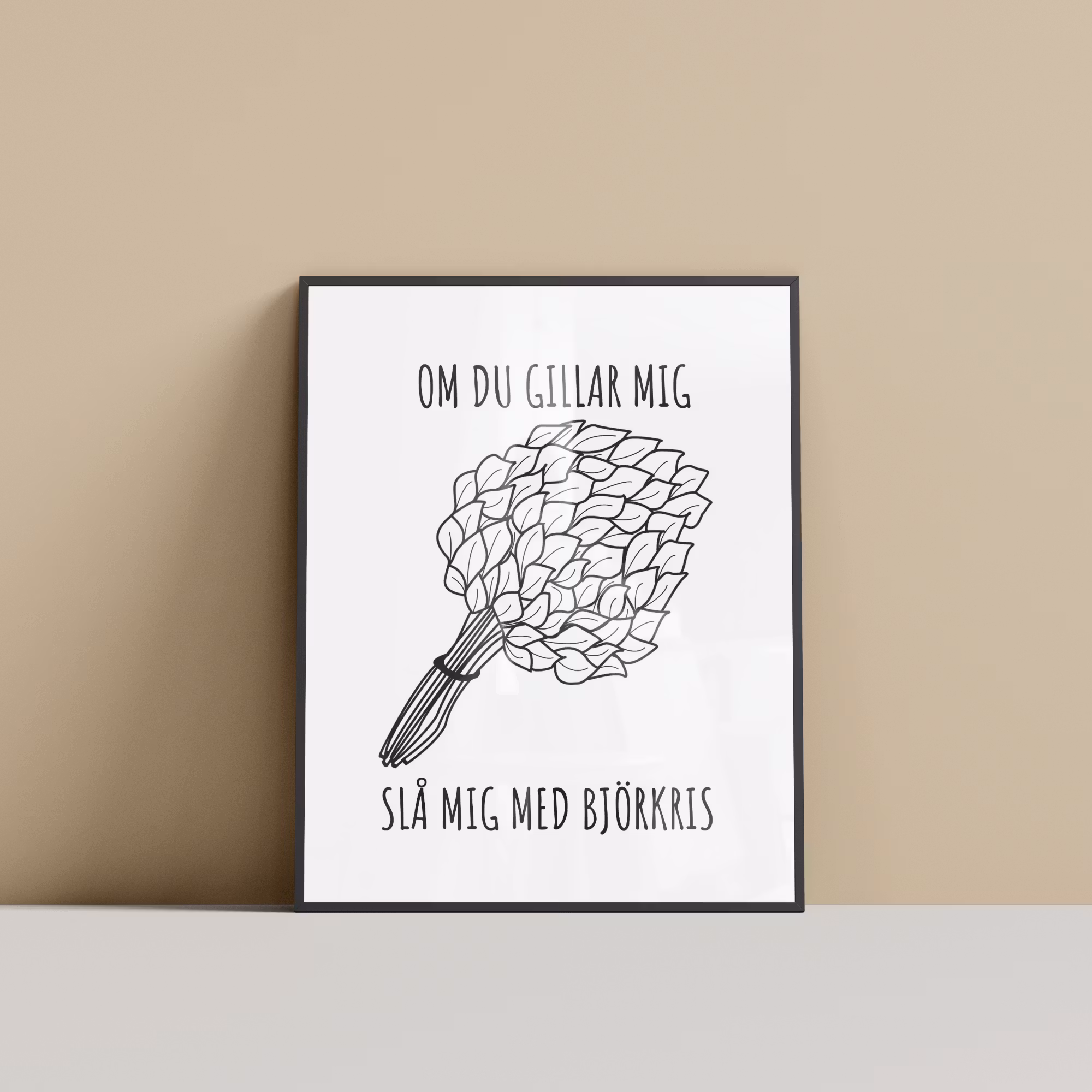 Lyft bastustunden och visa din kärlek med denna klassiska bastu-tavla! Ett traditionellt print i grönt, brunt och svart med text samt motiv av ett traditionellt björkris, vihta, som har träiga detaljer och en underbar känsla av sommar. Låt sinnena höjas, känn värmen från varje kärleksfullt rapp och föreställ dig den härliga doften av björkriset med detta print.