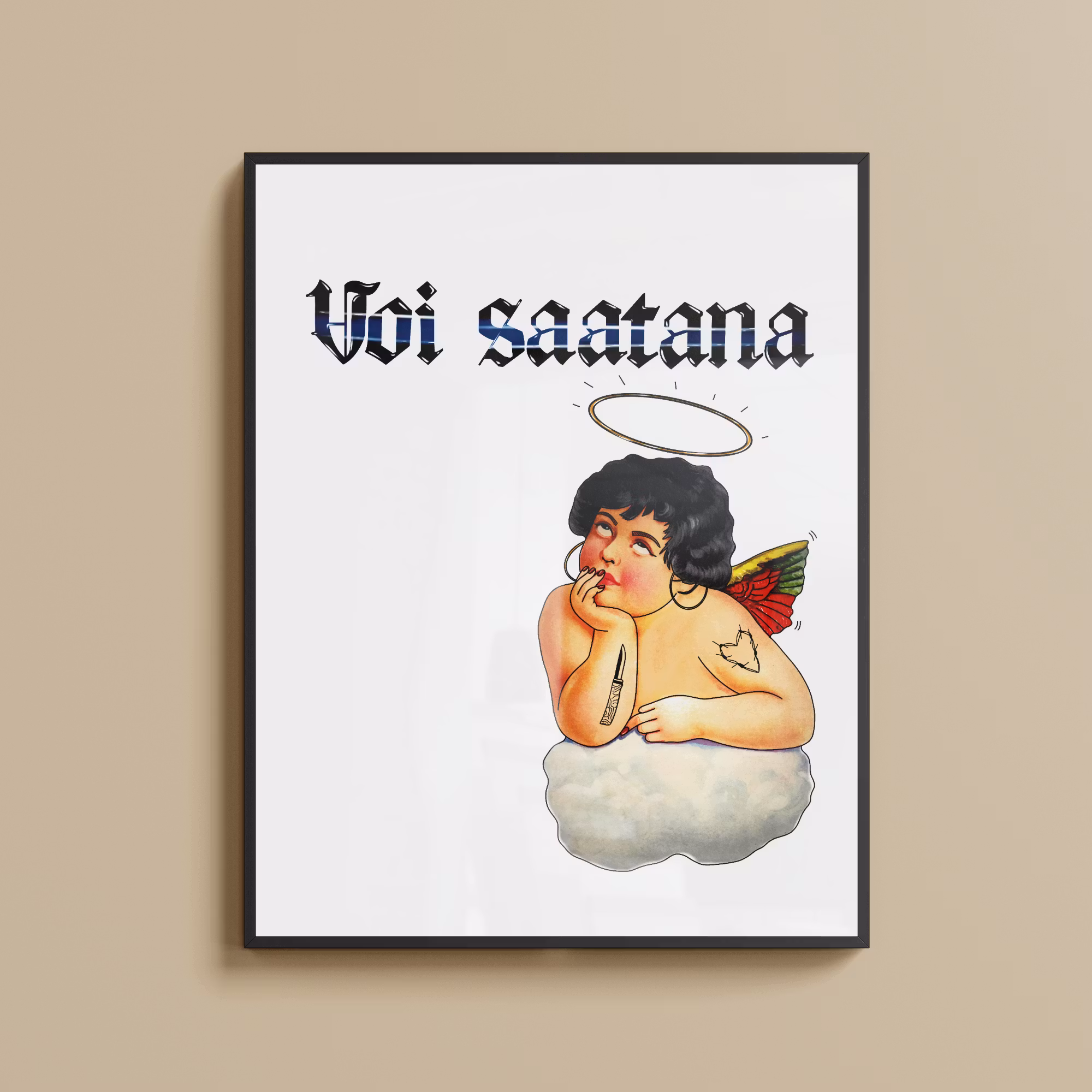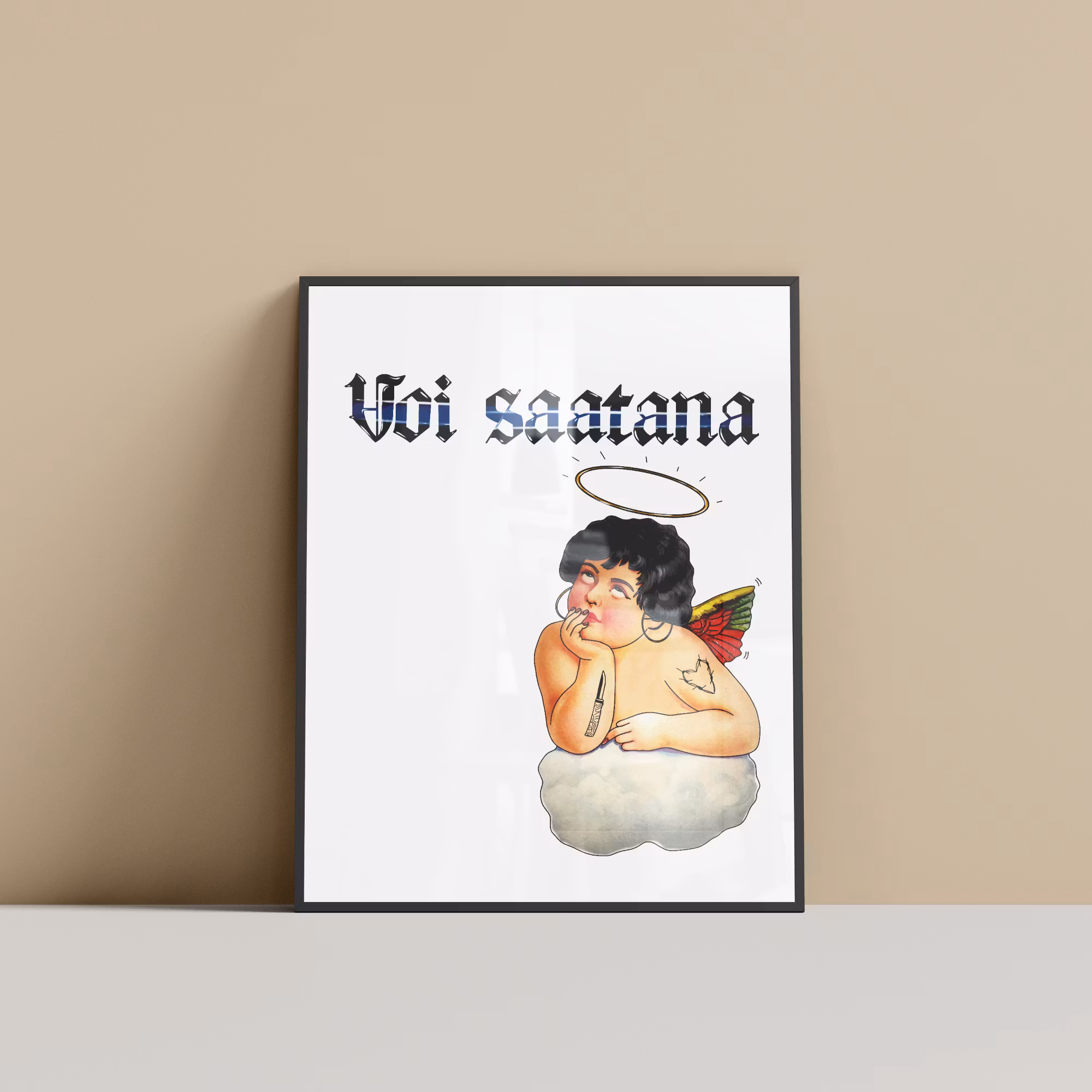 Enkel i sitt sätt. Enkeli betyder ängel på finska och denna ängel har ett finskt och rakt sätt att visa sitt missnöje. Finns att beställa i både A4 och A3!